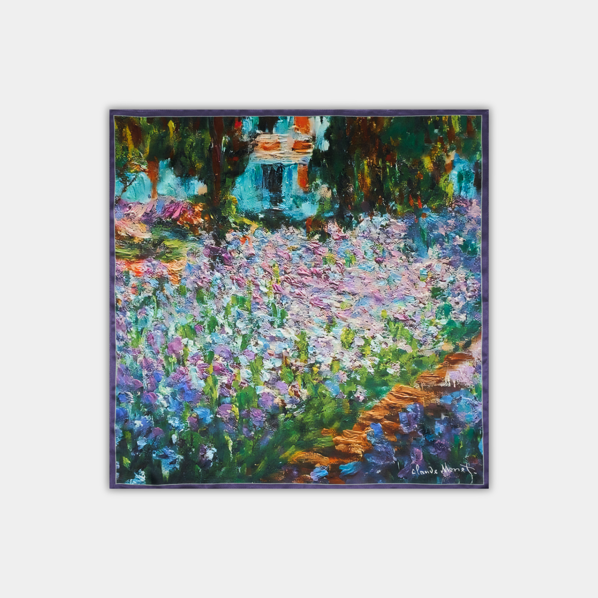 Šilkinės skarelės dizainas sukurtas pagal C. Monet paveikslą „Dailininko sodas Givernyje“. Aliejus, drobė. Prancūzija. 1900 m.